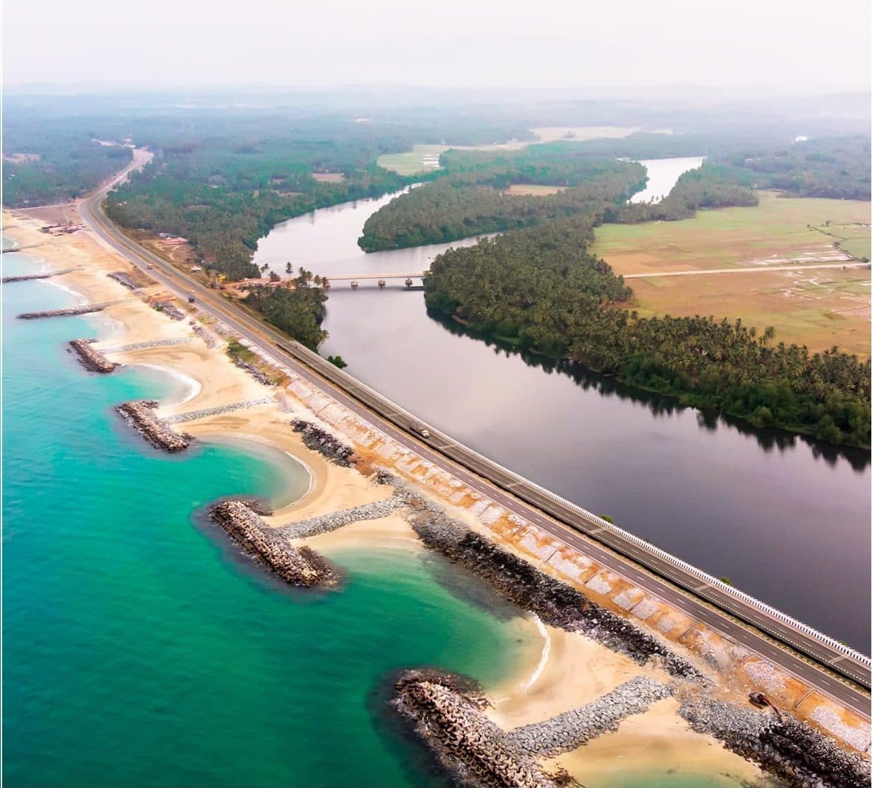 - 📸 Best Photo Spot: The designated "Maravanthe Viewpoint" pull-over bay on NH-66 where you can capture the black tarmac dividing the blue sea and green river.